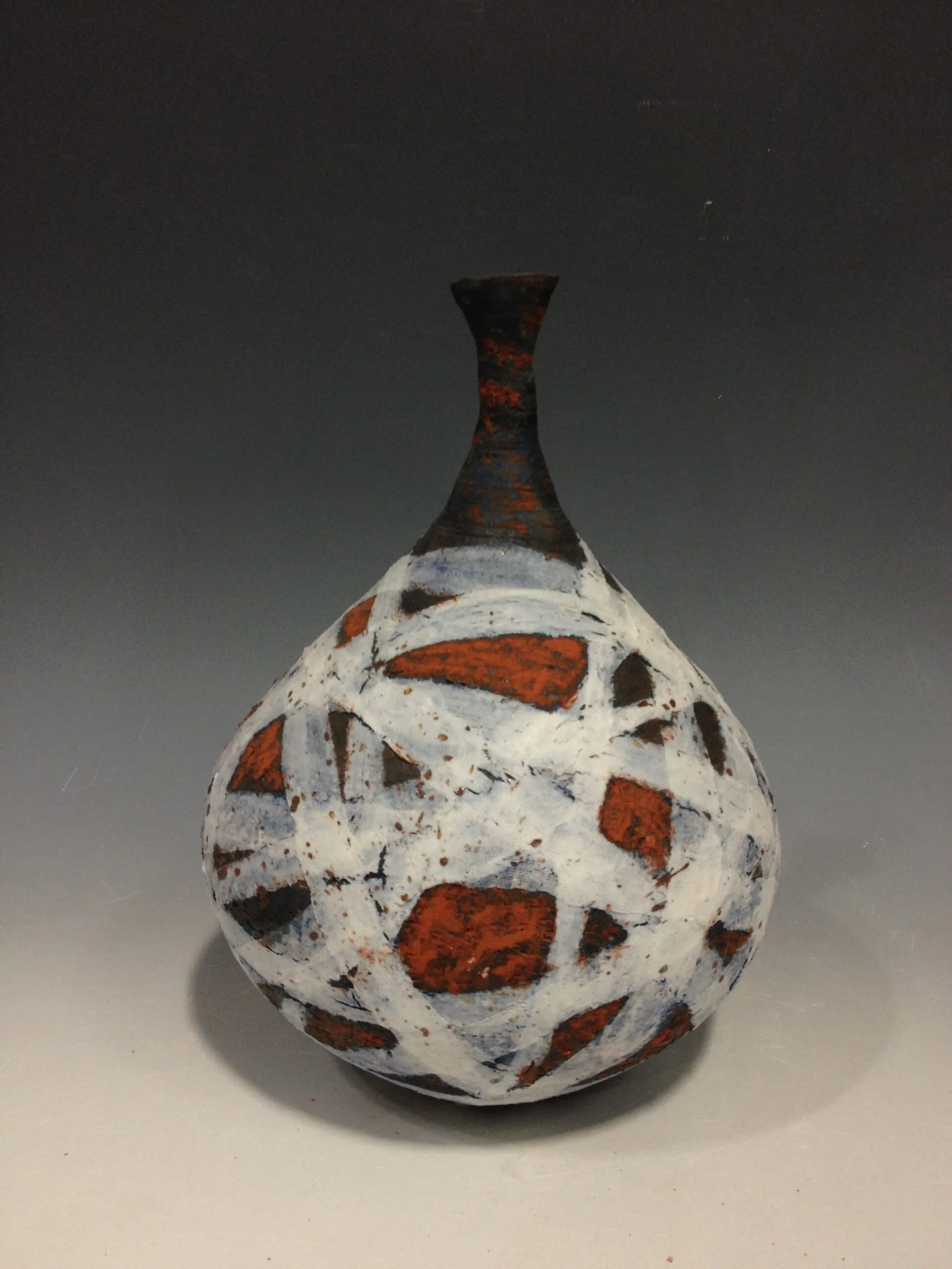 - 构图语言:艺术家打破了传统陶瓷装饰的对称性,利用粗犷的白色线条在器身上分割出大小不一、形状各异的几何色块(三角形、梯形等)。这些红黑相间的色块如同拼贴画一般,产生了强烈的视觉跳跃感。