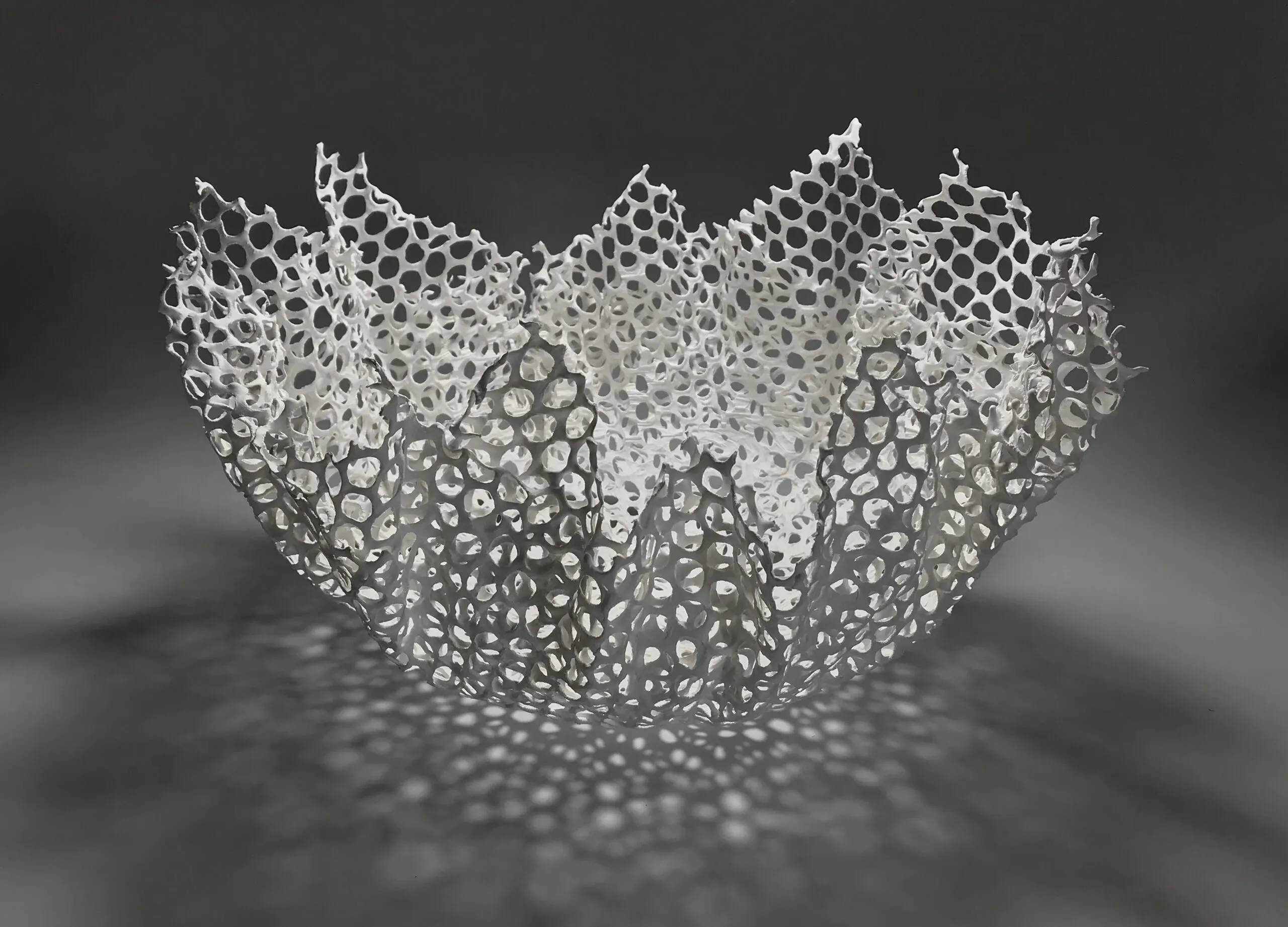 本作品通过高难度的镂空技法,探索了陶瓷材料在结构张力上的极限。艺术家将器皿的实用性剥离,仅保留其形态的骨架,使其成为光影的容器。作品利用“孔洞”这一负空间语言,构建了内外空间的对话。洁白的网状结构在光照下投射出迷离的影子,生动诠释了“洞见”——即“透过空无,洞察本质”的哲学隐喻,展现了材质脆弱与坚韧并存的独特美学。