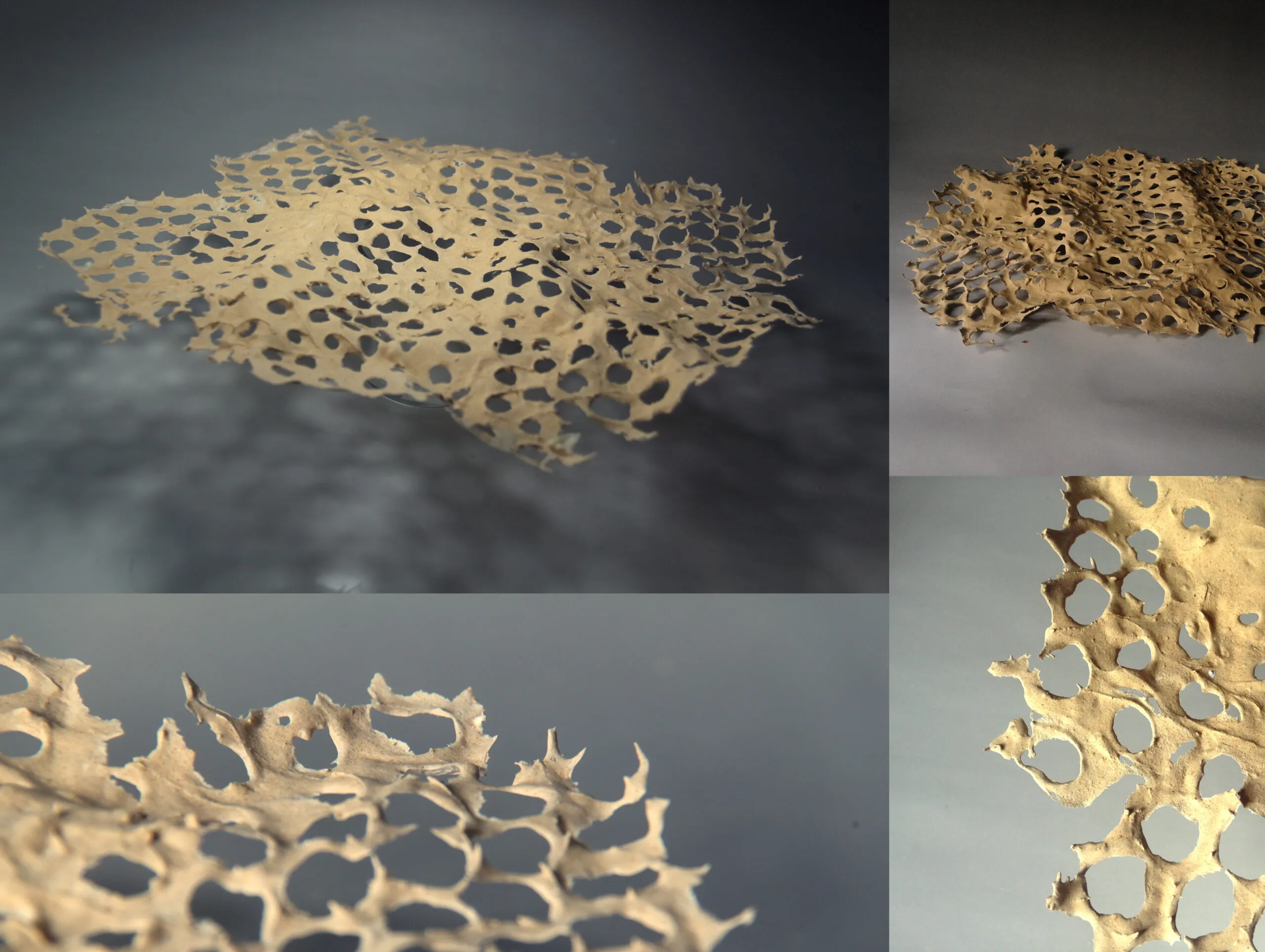 《浮》以轻薄、孔洞化的陶片结构呈现介于实体与空气之间的微妙状态。作品以极度减重的方式,让陶土仿佛失去固有的重量,像被风托起的薄膜,轻盈地悬浮于空间之中。其多孔的肌理源于对自然侵蚀、腐蚀与生长痕迹的观察,使表面既具有机的破碎感,又保持柔软流动的视觉节奏。