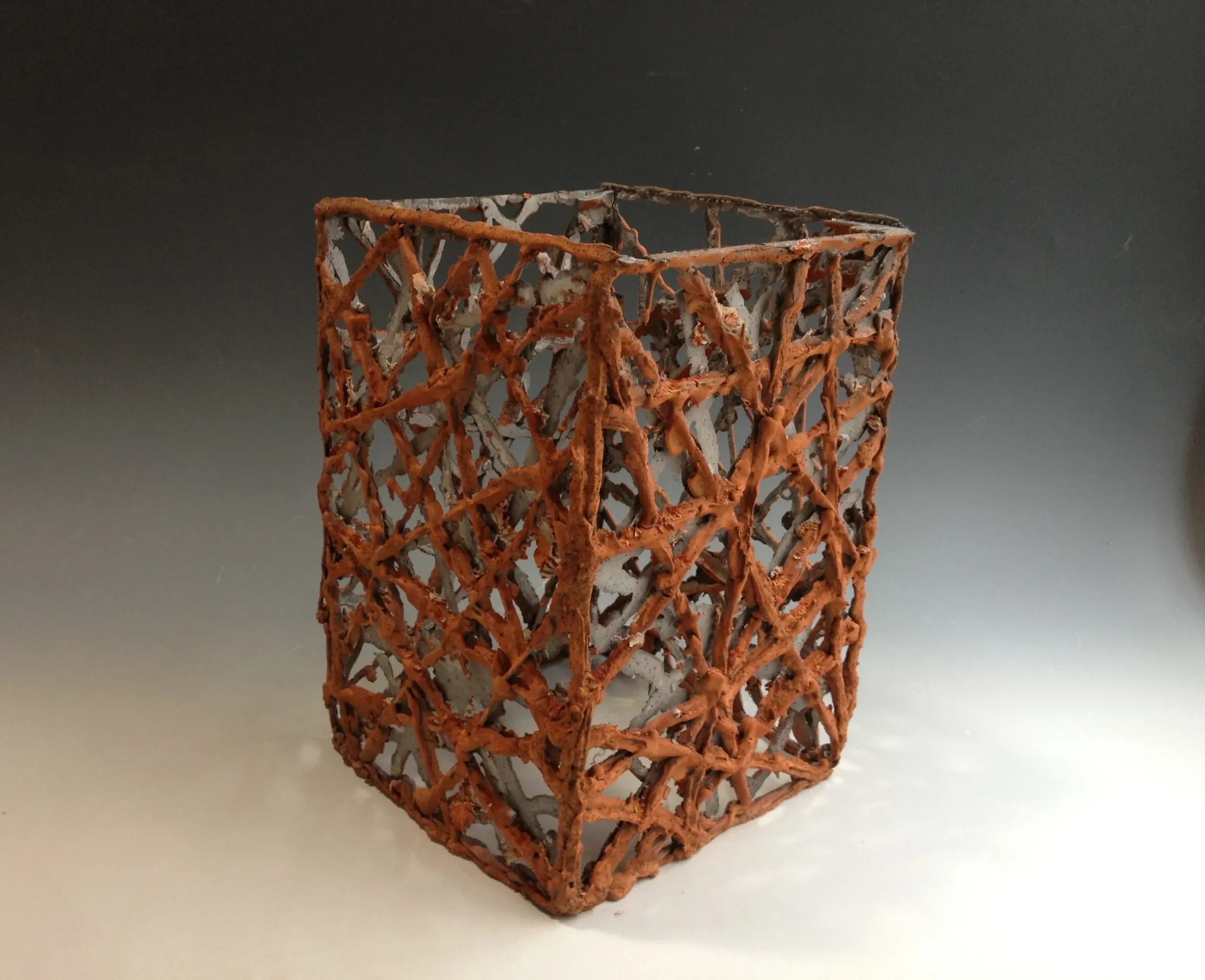 《流淌的空间》-红 是一件探讨“形”与“势”之间关系的陶艺力作。 艺术家以立方体这一最基础的几何形态为载体,却大胆地摒弃了封闭的四壁,运用缠绕、交织的线条构建出一个开放的骨架。 作品定格了泥浆在重力作用下流动的瞬间,将瞬间的动态凝固为永恒的静止。