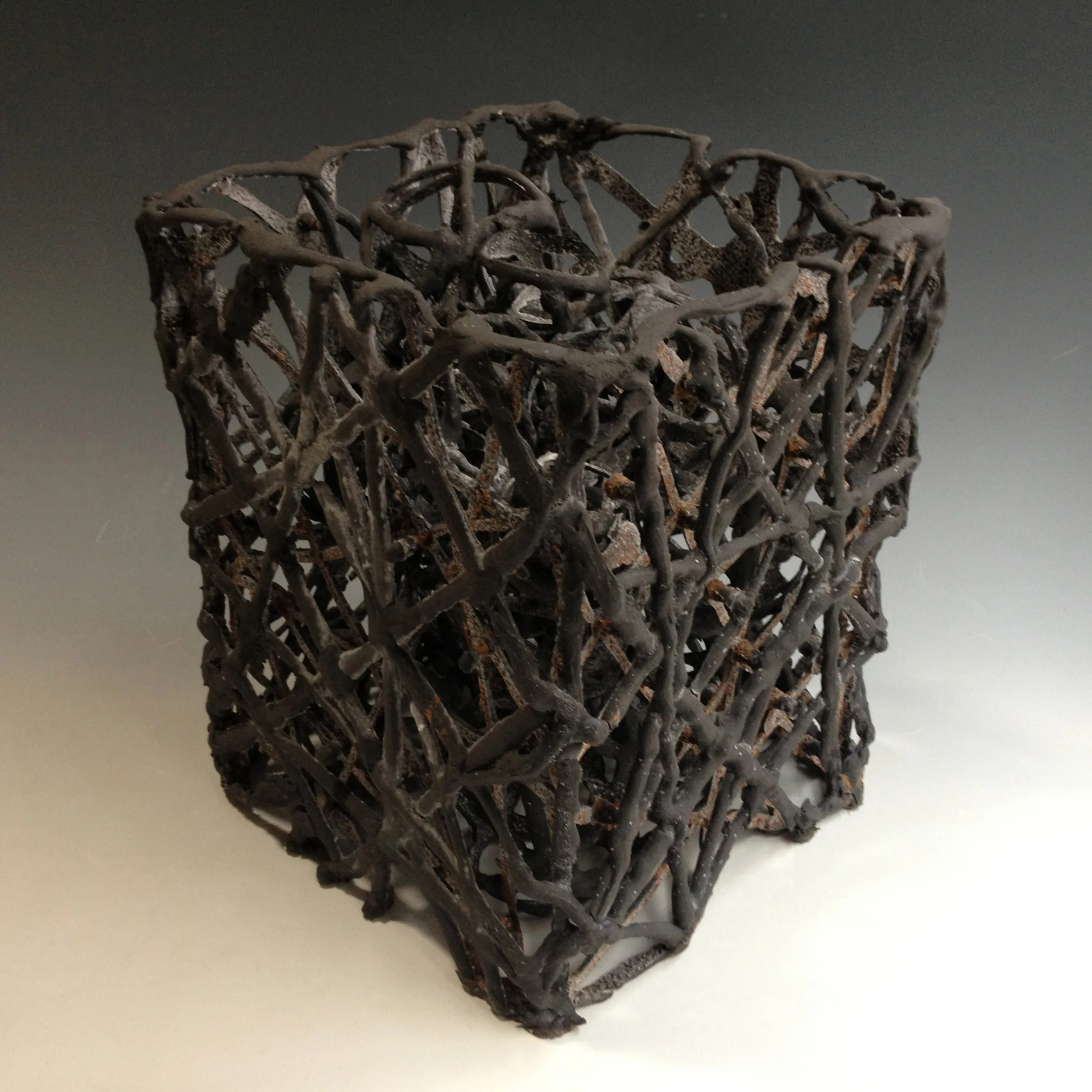 《流淌的空间》以陶土在高温中瞬息凝固的痕迹为线索,构建出一个由流动、缠绕与交叠所形成的开放性结构。作品以手势般的轨迹累积空间,呈现如同液态在空气中被定格的瞬间。粗犷的枝状纹理既显露材料的力量,也让光线在孔隙间自由穿行,使空间不再是被容纳的内部,而成为被“流淌”描绘出的存在。作品意在探索陶土的可塑性边界,在结构与非结构之间寻找一种介于稳定与生成的动态秩序,呈现空间从形成到凝结的生命力。
