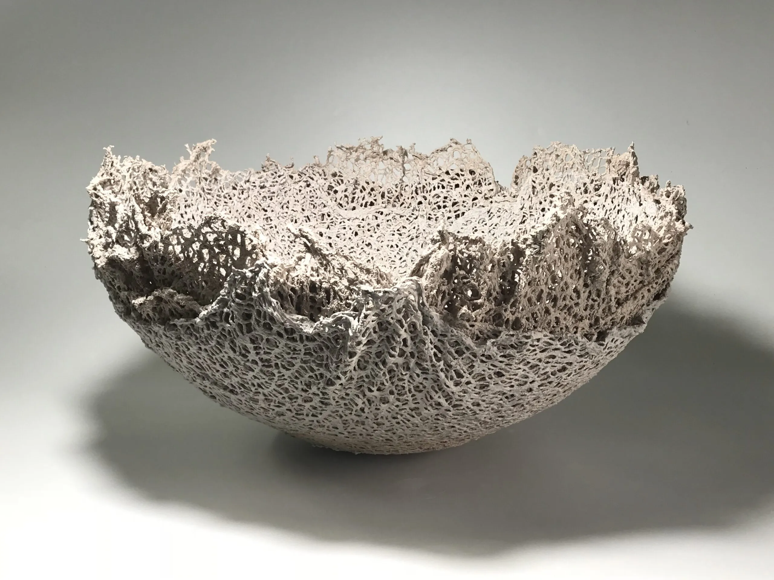 在《泥纱系列三》中,作者特意保留了口沿处自然崩裂、卷曲的边缘形态。这种看似“残缺”的处理,实则是对材料自然属性的尊重。它记录了泥土在干燥与收缩过程中的挣扎与张力,赋予了无生命的材质以有机的生命体征,隐喻着时光的流逝与物质的演变。