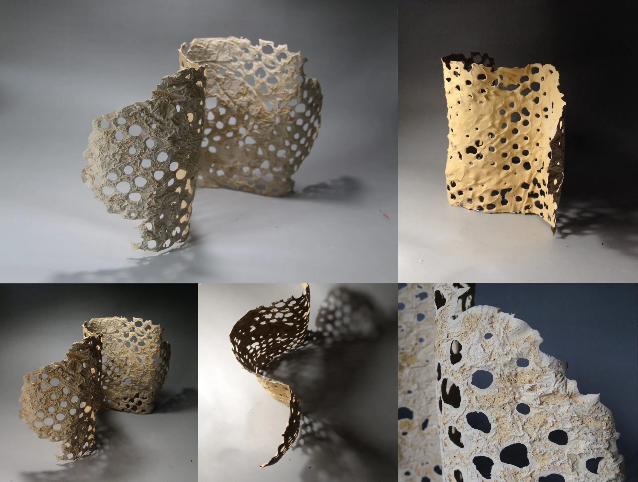 - 光与影的容器:布满全身的孔洞不仅打破了陶瓷的封闭感,更使其成为光的容器。光线穿透这些不规则的孔隙,在作品背后的墙面或地面投下斑驳的阴影,使得坚硬的陶瓷仿佛拥有了呼吸的通透感,虚实相生。